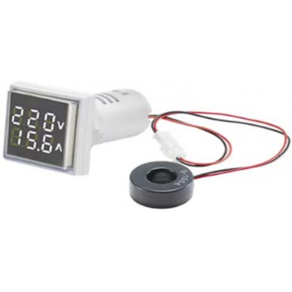 Βολτόμετρο ( 0-300V AC ) με αμπερόμετρο ( ο - 100Α ) για στήριξη σε πρόσοψη. Η μέτρηση ρεύματος γίνεται επαγωγικά χωρίς κόψιμο καλωδίου. Διαστάσεις: 30x30x50 χιλιοστά.